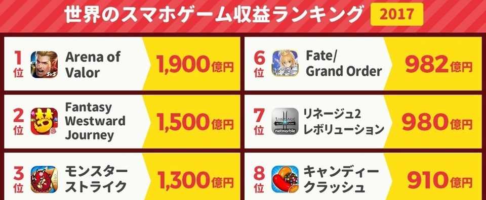 モンスト1 300億円 Fgo 9億円 ポケgo 0億円 17年のアプリ収益データとツイートまとめ アプリマーケティング研究所 Note